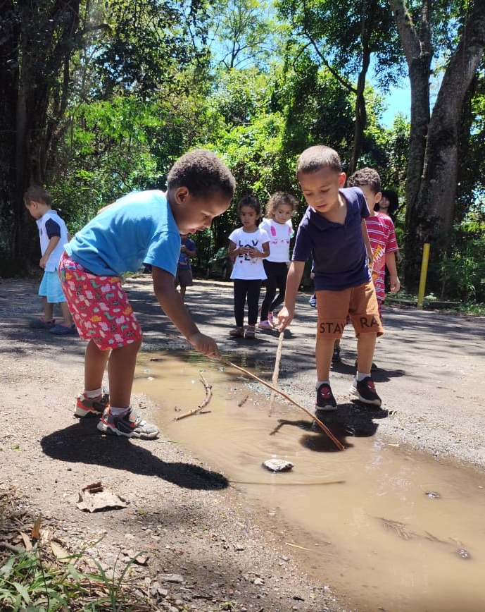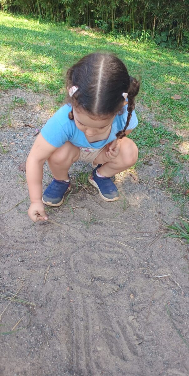 Conforme destaca a Equipe Criança e Natureza (2018), “a criança, ao entrar em contato com a natureza, realiza uma imersão sensorial e afetiva, tocando, sentindo e descobrindo o mundo ao seu redor, o que é fundamental para seu desenvolvimento integral”. Quando bebês e crianças exploram a natureza, eles não estão só brincando, estão desvendando um mundo de texturas, cores e cheiros. Cada folha, cada pedra, cada galho se torna um brinquedo, um convite à imaginação. Uma poça d’água vira um espelho mágico ou um oceano a ser navegado por gravetos-barcos.