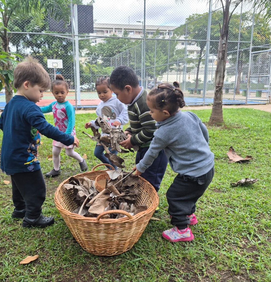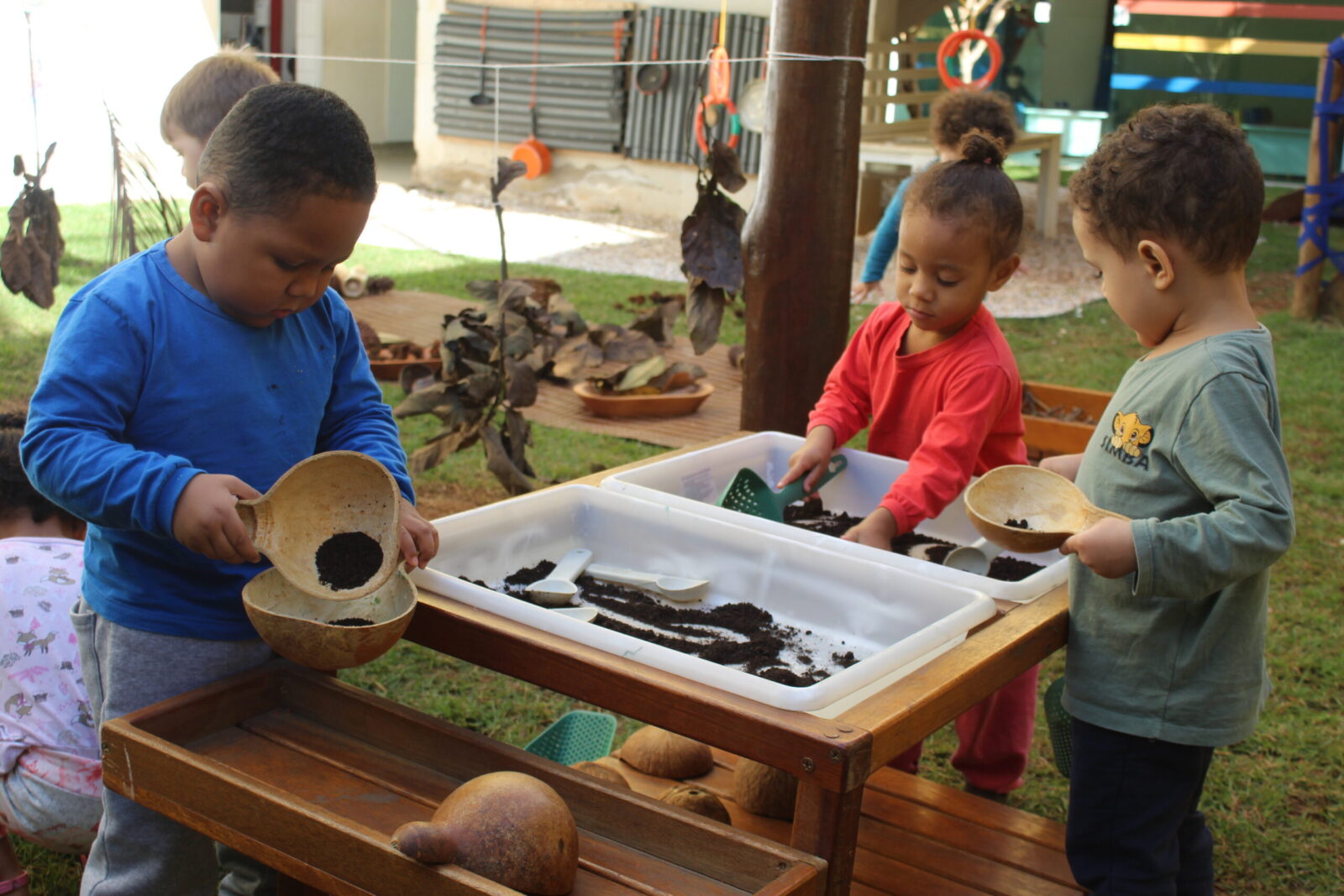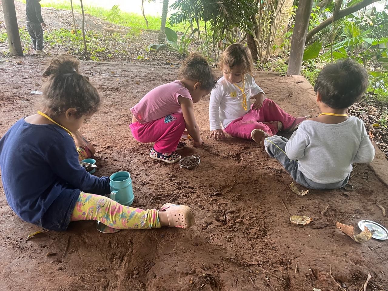 A exploração dos elementos naturais faz com que os bebês e as crianças conheçam as características, as propriedades e as brincadeiras de faz de conta que acontecem. A terra e a areia se transformam em “comidinhas”, os gravetos são usados na maior parte das brincadeiras como utensílio para as misturas da terra ou da areia com a água. E as folhas? Ao serem lançadas no ar, quando descem como “chuva”, dão um espetáculo de cores e sensações. Os sorrisos e a diversão são garantidos quando percebem o toque das folhas em seus corpos.