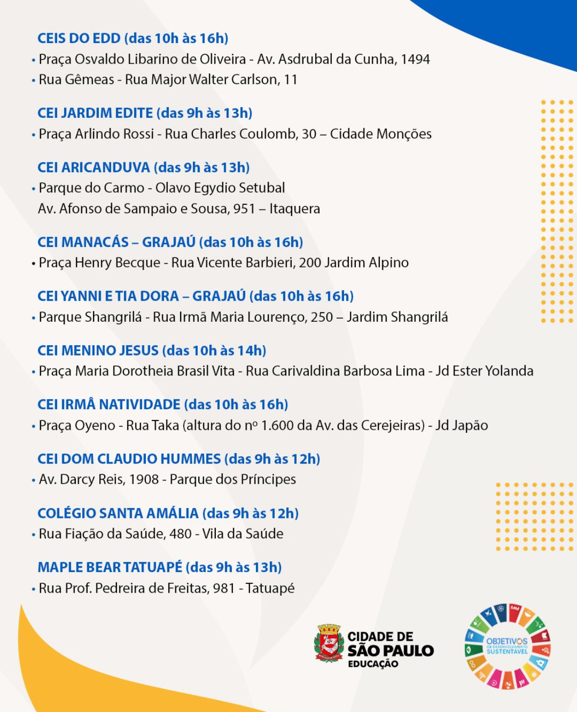 Praça Maria Dorotheia Brasil Vita- Rua Carivaldina Barbosa Lima – Jd. Ester Yolanda - CEI IRMÂ NATIVIDADE (das 10h às 16h)